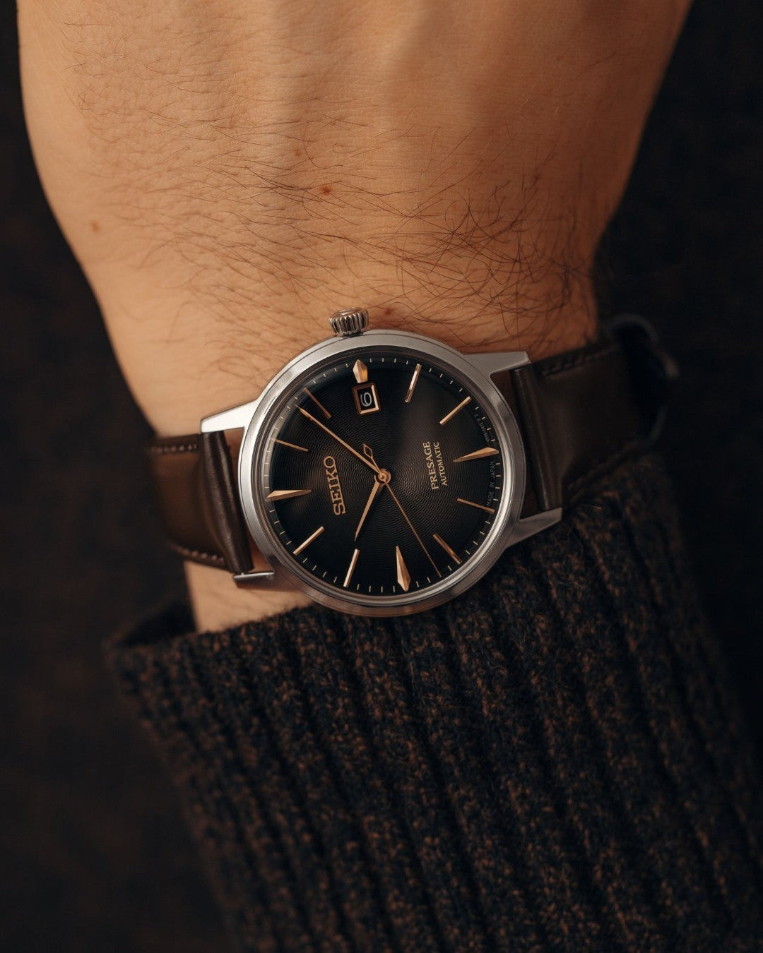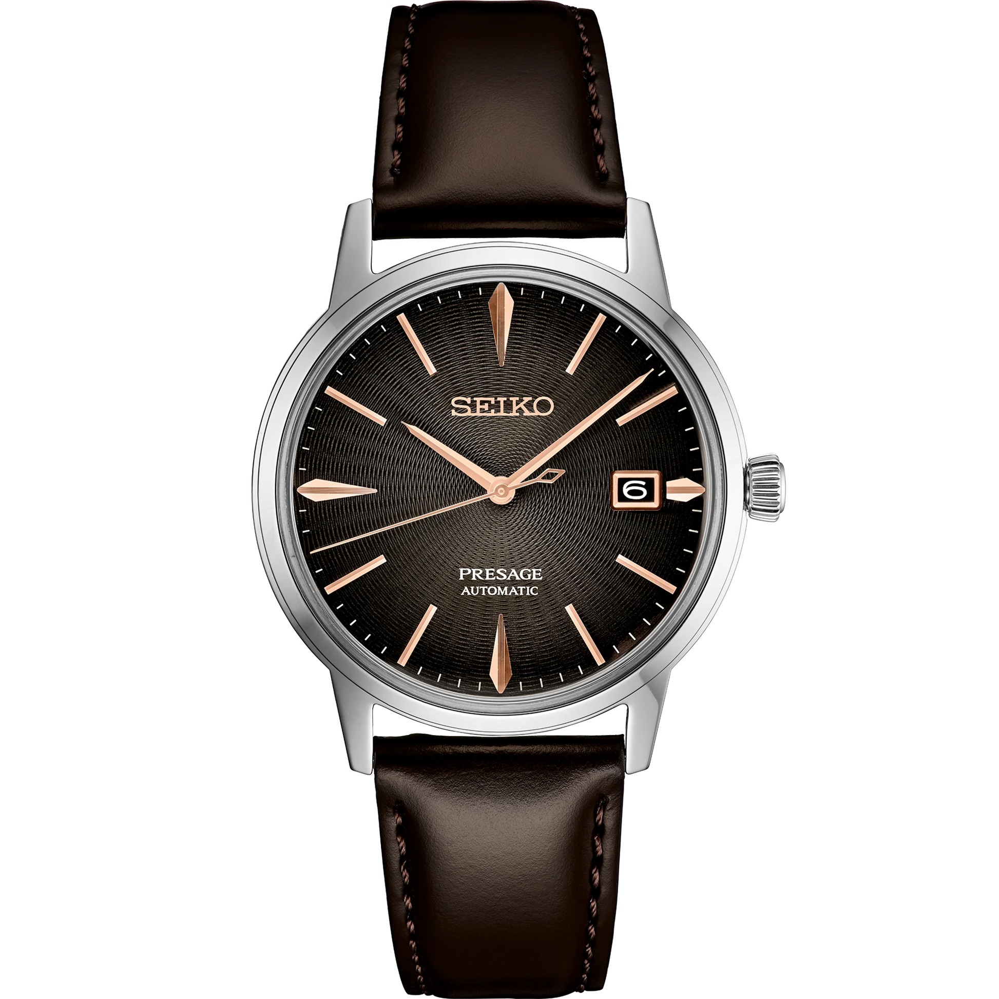 The Seiko Presage SRPJ17 is an elegant mechanical timepiece, drawing inspiration from Tokyo’s vibrant cocktail culture. The gradient gray-brown dial with pressed pattern and gloss finish is accented with rose gold-tone hands and markers, evoking the sophistication of the Irish Coffee cocktail.